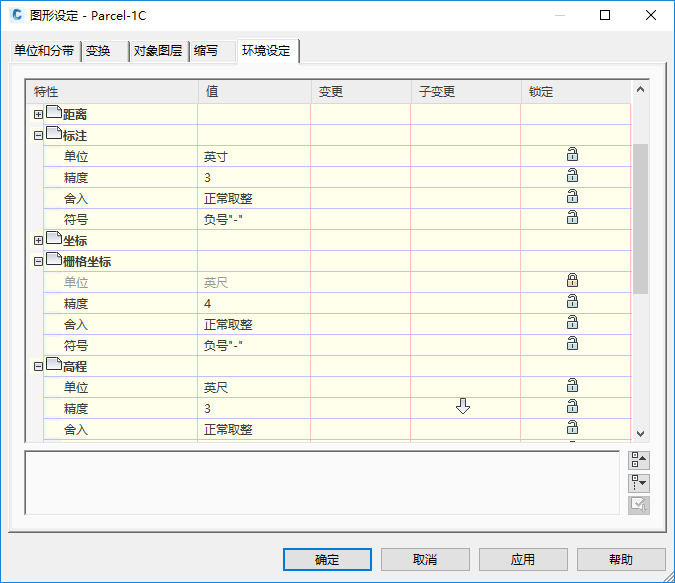 在“环境设定”选项卡上,在为图形中的一个或多个要素(对象)更改过的任何设置所对应的“子变更”列中,您会看到一个箭头。您可以通过单击该箭头取消替代,并可以锁定任何设置以防止在要素级别的替代。
