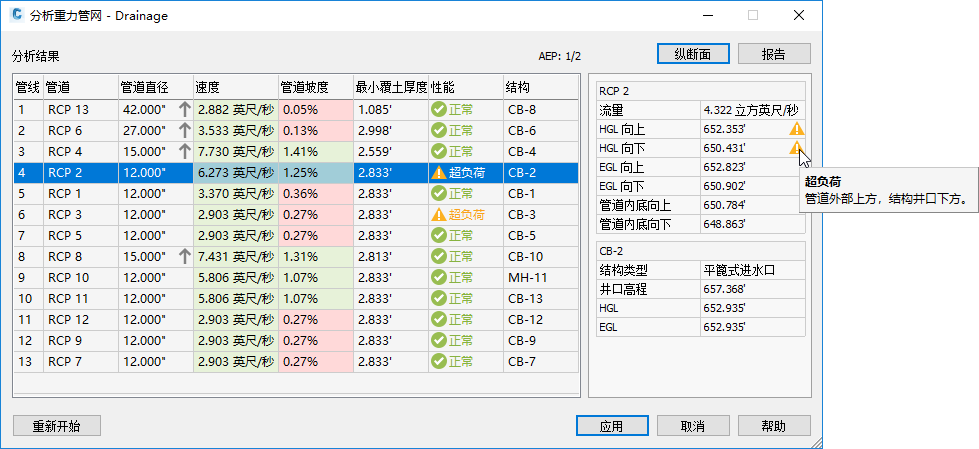 单击“分析重力管网”对话框中的“分析”按钮时,“结果”页面将会显示。