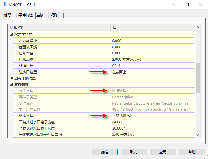 注: 在增加映射排水结构参数功能后,“使用井框尺寸”设定已从“编辑要素设置 - 结构”对话框的“零件生成器结构的进水口详细信息”部分中删除。有关排水结构参数映射的更多信息,请参阅为重力管网分析映射排水结构参数
