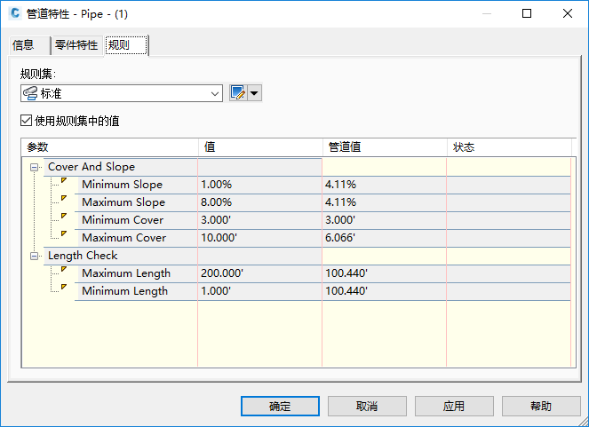 下图是图形中某一管道上“规则”选项卡的示例。在此示例中,此管道的“最小覆土厚度”和“最大长度”特性将与“管道值”列中说明性的违反规则文本 一同显示,因为其违反了“”列中指定的设计规范。请注意“状态”列中显示的违反规则说明性文本;例如“已超出最小管道覆土厚度”和“超出最大管道长度的值”。
