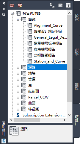 “工具空间”中的“工具箱”选项卡是运行报告和扩展程序的主要界面。与“测量”选项卡一样,您可以根据需要显示或隐藏“工具箱”选项卡。