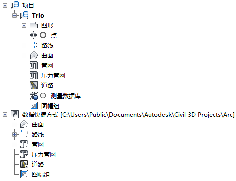 该图显示了名为 Trio 的 Vault 项目的集合和名为 Arc 的数据快捷方式项目的集合。 这两种项目类型均是从默认项目模板创建的。 因此,它们具有相同的曲面集合、路线集合和可以在多个图形中参考的其他对象的集合。