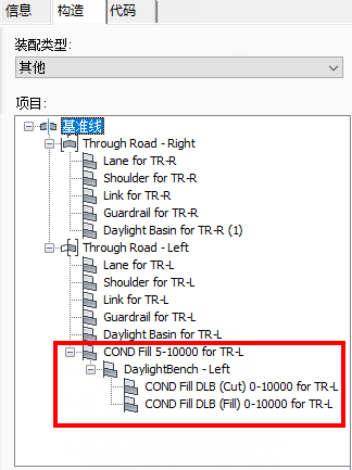 - 在“项目”列表中,选择位于装配左侧的条件部件。再次单击以亮显文字。更改名称,以使其指示根据设置要检测的条件类型。在以下示例中,第一个条件部件的名称已更改为 COND Fill 0-5 for TR-L。在此示例中,COND 指示了部件为条件部件。Fill 指示了激活部件的条件类型。0-5 指示了部件期望的填方条件的最小距离值和最大距离值。在此示例中,TR-L 是对与此特定部件相关联的上级装配的名称的引用(在此例中为“Through Road”或“TR”和“Left side”或“L”)。