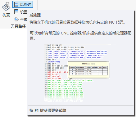 当您将屏幕上的刀具路径图像转换为针对特定 NC 机床的语言时,将进行后处理。该输出通常采用 G 代码的形式,即用于驱动机床的字母数字格式。其他机床将此 G 代码格式的变体用于其控制器。因此,尽管存在某种代码标准化,但部分机床使用不同的 G 代码格式。因此,Fusion 提供各种不同的后处理器。可将后处理器看作语言转换器。