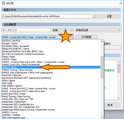 在“后处理”对话框页面上有很多选项可以控制。我们要重点介绍的事情是,选择正确的机床后处理器。下拉对话框中“后处理器配置”部分下的列表,然后滚动到 Fanuc 常规后处理器。Inventor HSM 包含大量精选的后处理器,用于各种 CNC 控制器。