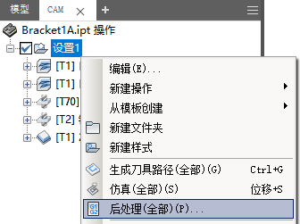 您可以对任意一个刀具路径或刀具路径的任意组合进行后处理。若要选择所有刀具路径,请单击“浏览器”中的“设置”。选择刀具路径后,可以在操作上单击鼠标右键,然后选择“后处理”。您还可以通过下拉“操作”面板来访问该选项。