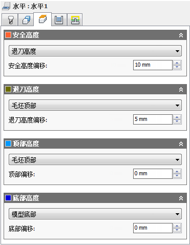 “退刀高度”用于设置在进入下一个切削加工路径之前刀具向上移动的高度。“退刀高度”应设置为高于“进给高度”和“顶部高度”。“退刀高度”与后续偏移一起使用来确立高度。