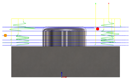 上图显示了围绕具有两个浅平面 Z 层(红色圆点旁边)的中心部分进行加工的挖槽刀具路径。橙色圆点表示一个主要步进。在该图中,浅平面加工路径不会清除整个 Z 层,因为它们不会像主步进那样延伸到零件边界之外。