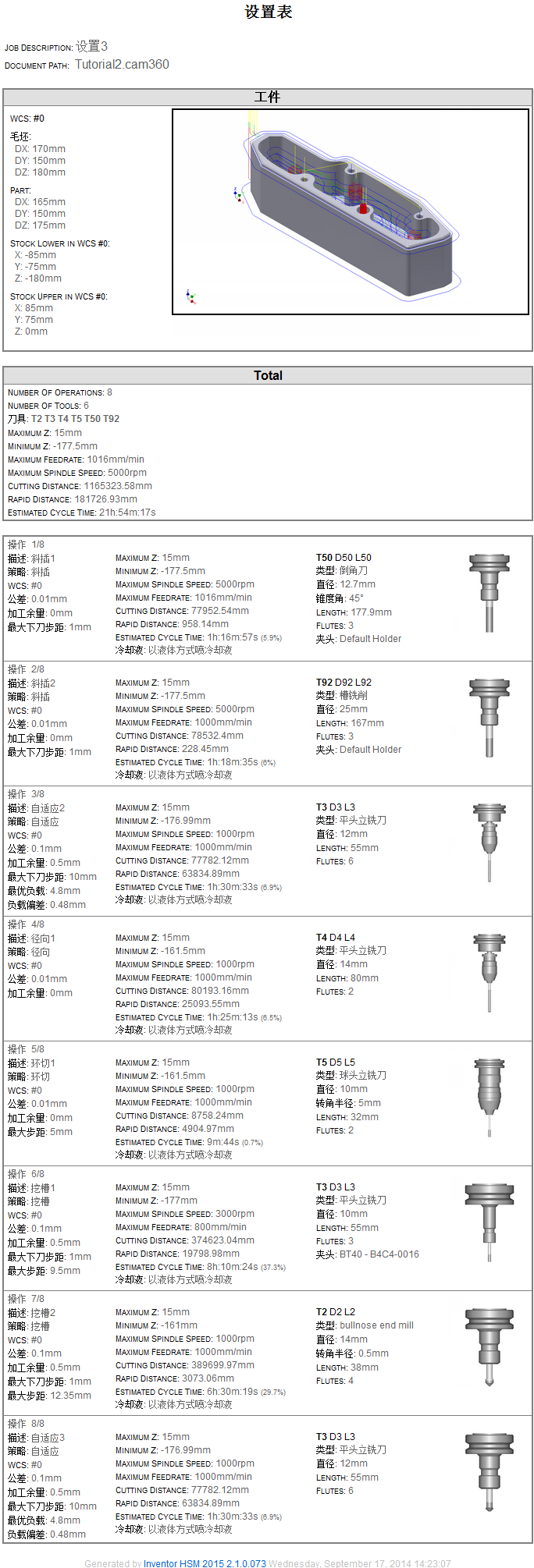 利用“设置表”功能,您可以为 CNC 操作员生成 NC 程序的概览。Inventor CAM 包含多个设置表,其中 HTML 设置表是默认设置表并且可完全自定义。
