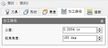 “雕刻”的目的是通过沿转角相交区域移动刀具,在挖槽中创建锐角。如果边之间的角度大于此值,则不会有转角清除移动。