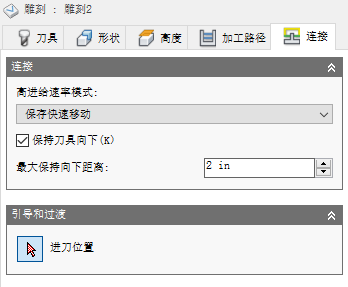 禁用:禁用“进给高度”会导致刀具向下快速移动为导入。
