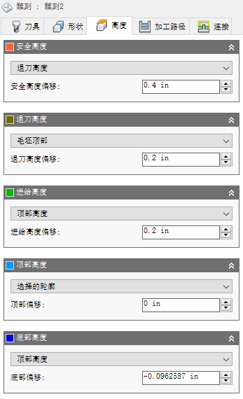 “退刀高度”用于设置在进入下一个切削加工路径之前刀具向上移动的高度。“退刀高度”应设置为高于“进给高度”和“顶部高度”。“退刀高度”与后续偏移一起使用来确立高度。
