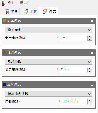 “退刀高度”位置可设置安全高度位置和底部高度位置之间的中间高度,在探测移动之间使用。“退刀高度”与“偏移”一起使用来确立高度。