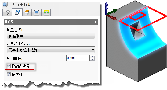 为了避免该问题,请启用“接触点边界”设置,以便边界限制刀具接触点,而非刀具中心点。