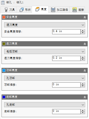 “退刀高度”用于设置在进入下一个切削加工路径之前刀具向上移动的高度。“退刀高度”应设置为高于“进给高度”和“顶部高度”。“退刀高度”与后续偏移一起使用来确立高度。