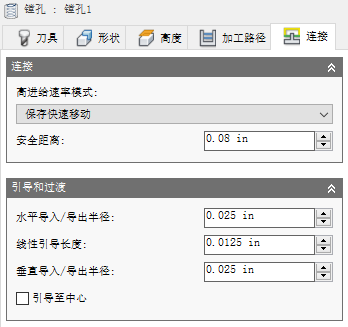 当刀具从进刀移动转到刀具路径本身时垂直弧平滑的半径。
