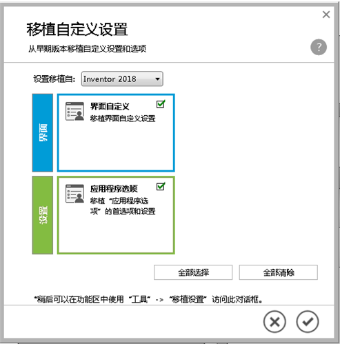 使用“移植自定义设置”可以将现有自定义和“应用程序选项”设置移植到最新的 Inventor 版本。在展开过程中,管理员还可以额外地控制此选项的使用。
