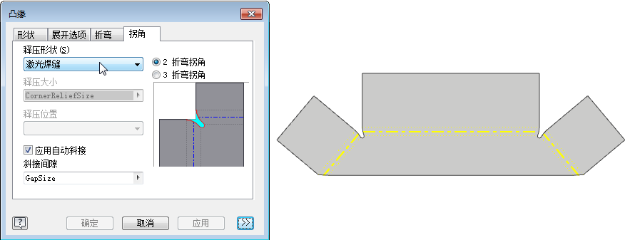 线性焊缝拐角释压终止于点上,圆弧焊缝拐角释压形状终止于直线段。新的激光焊缝拐角释压终止于相切圆弧,更适合于激光切割零件。