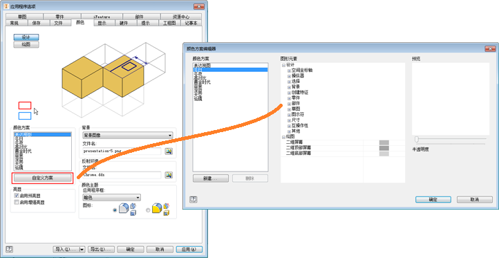 颜色方案编辑器将作为 Inventor 2019 的一部分安装。您可以从“应用程序选项”>“颜色”选项卡访问该编辑器。自定义将保存到“应用程序选项”xml 文件。