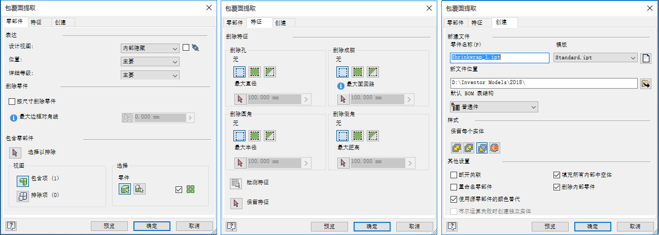 在第一次使用包覆面提取时,对于熟悉原行为的用户,会注意到对话框的整合。将三个选项卡包含在一个对话框中。