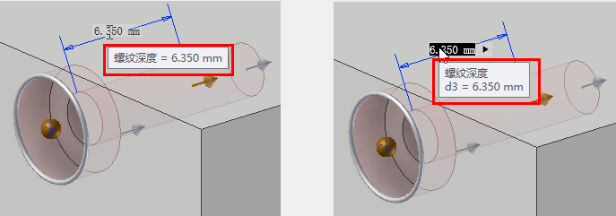 对于“孔”命令,当值无效时,例如,指定的螺纹长度大于孔深度,则值颜色将变为红色,并且当您输入值时工具提示将报告值无效。这使您可以立即更正该值,或者查找需要编辑的另一个值,以使其生效。如果值有效,则值颜色为黑色。