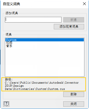 注: 默认自定义词典和新创建的自定义词典的默认位置为设计数据文件夹。
