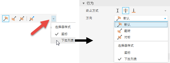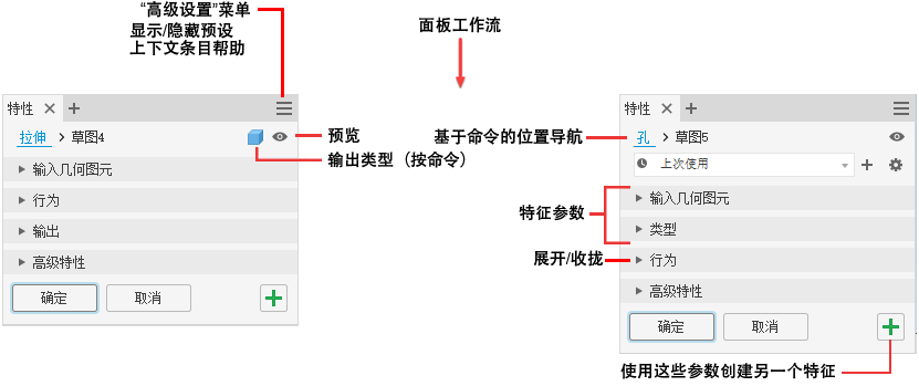 特性面板支持上下文访问用于创建和编辑特征的参数。