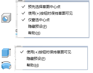 在大多数情况下,这些设置默认情况下处于启用状态。选择菜单项可启用/禁用该选项。这些设置的特性面板状态在会话之间会继续保留。因此,如果您想要稍后使用它们,需要重新将其启用。这些设置也会根据文件类型(IAM 或 IPT)而不同。 例如,“使用(+)按钮时保持草图可见”仅适用于零件特征。