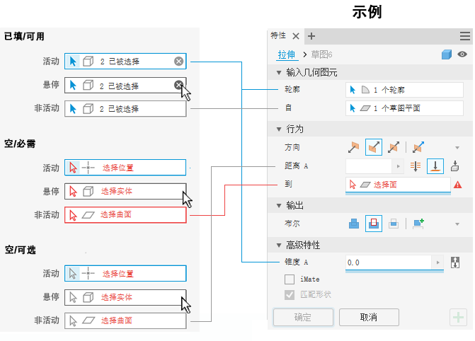 特性面板选择器会使用颜色显示其状态。下图显示了相关状态以及对应的示例。