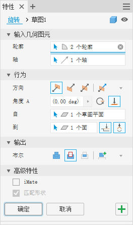 有关后续步骤,请参见下面的使用特性面板定义旋转特征。