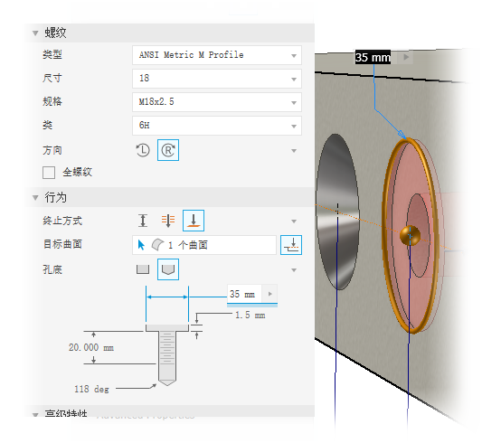 螺纹孔可使用您定义的螺纹创建孔。按英制或公制标准尺寸指定螺纹孔。对于零件孔特征,可以从列表中选择常用螺纹尺寸,然后系统将会计算其直径。