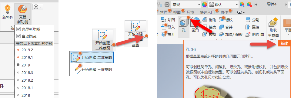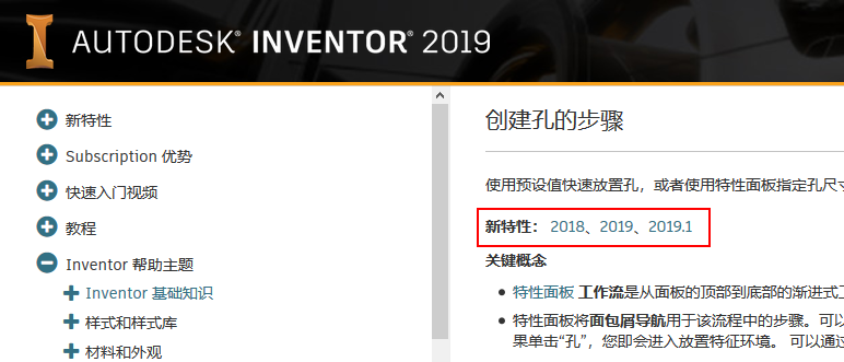对于显示“新建”或“更新的”标记的命令,在使用 F1 键进入帮助页面时,在该页面的顶部,您将会看到“新特性”主题的链接,它将说明特征或命令的更改情况。这些链接显示相关更改生效的版本。