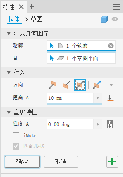 方向: 默认 - 仅沿一个方向拉伸。拉伸终止面平行于草图平面。