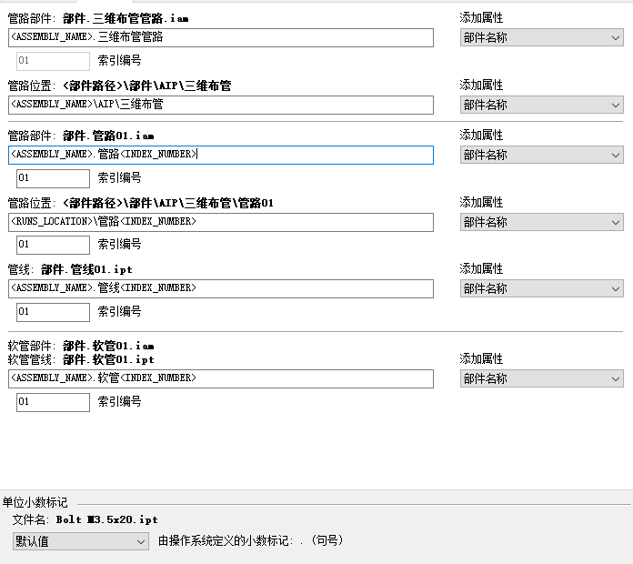 指定如何在三维布管中创建文件和文件夹。使用“添加属性”下拉列表中的选项配置命名方案。