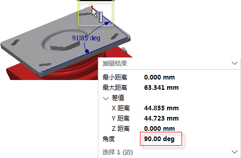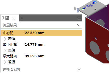 在同一平面上选择以下 2 种类型的几何图元(顶点、直线、圆弧和圆)时,“最大距离”也会显示。