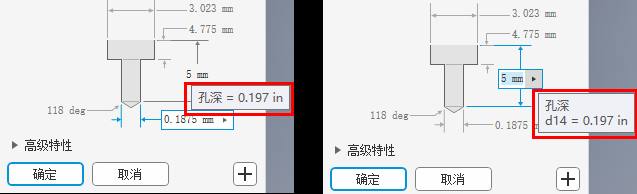 对于“孔”命令,当值无效时,例如,指定的螺纹长度大于孔深度,则值颜色将变为红色,并且当您输入值时工具提示将报告值无效。这使您可以立即更正该值,或者查找需要编辑的另一个值,以使其生效。如果值有效,则值颜色为黑色。