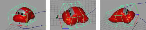“约束 > 运动路径 > 流动路径对象”(Constrain > Motion Path > Flow Path Object)命令使对象运动路径中与曲线保持一致,从而在运动过程中弯曲和扭曲。变形由围绕对象的晶格创建,或者沿路径长度创建。