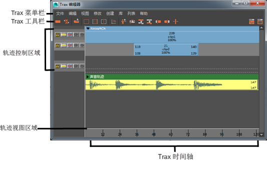 “Trax 编辑器”(Trax Editor)窗口有四个工作区域: