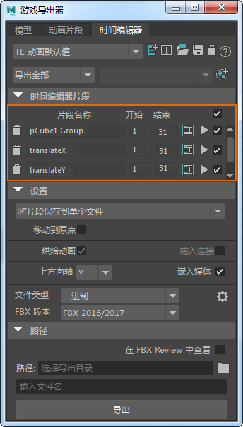 “时间编辑器”(Time Editor)可用于将动画片段及其参数导出到“游戏导出器”(Game Exporter)中。