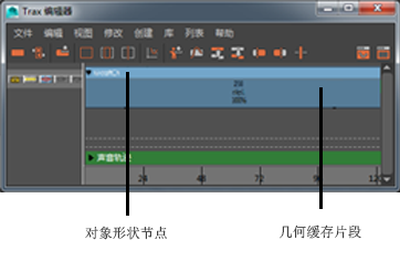 选定对象的所有几何缓存节点都将作为缓存片段加载到“Trax 编辑器”(Trax Editor)中。每个片段都放置在它自己的轨迹上,并且对象的所有缓存片段都在对象的形状节点下进行分组。