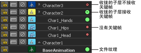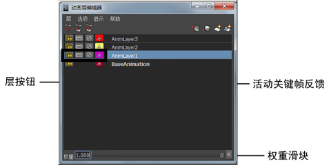 “动画层”(Animation Layer)窗格包含三个影响堆栈中动画层的主要组件: