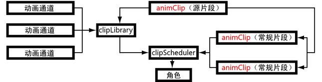 当创建片段时,已设置动画的角色通道将断开与 节点或对象的连接,然后连接到 节点。片段库节点管理和跟踪角色的所有源片段。片段库和角色的所有常规片段会连接到 节点。片段调度器管理和跟踪角色的所有常规片段。
