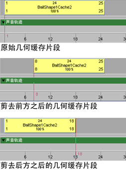 可以修剪几何缓存片段以略去缓存片段的开头或末尾的变形分段。这会更改缓存片段的“源输入”(Source In)“源输出”(Source Out)时间。修剪缓存片段不会影响磁盘上与其关联的缓存文件。使用修剪功能从缓存片段中略去的分段不会被删除,在还原缓存片段的原始长度时,可以恢复这些分段。