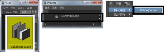 源片段可以在“Visor”、“大纲视图”(Outliner)和“库”(Library)中找到。