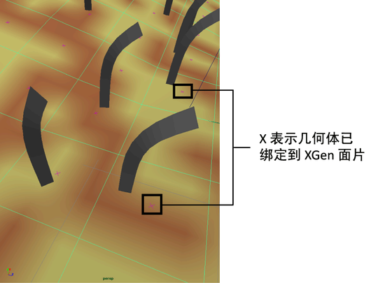 进行标识。在场景视图中,将显示绑定到 XGen 面片的区域,并在几何体面的中心处显示洋红色 X。面片没有需要修改的属性。可以使用“绑定面”(Bind Face)菜单选项,更改绑定到面片的多边形面。