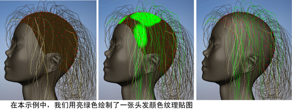 仅当使用“Paint Effects”头发输出时,绘制头发纹理才有意义。如果仅使用 NURBS 曲线输出,将看不到任何效果(因为头发曲线不受该功能影响)。