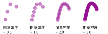 如果将“图章密度”(Stamp Density)设定为 1,绘制路径将看上去像一条由只有边缘接触的圆组成的一条线。如果将“图章密度”(Stamp Density)设定为大于 1,则这些圆将按其一个宽度因子重叠(例如,如果“图章密度”(Stamp Density)为 2,则这些图章将重叠其宽度的一半)。如果将“图章密度”(Stamp Density)设定为小于 1,则这些图章之间将留有空间。