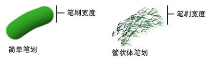定义笔刷的宽度,采用 Maya 工作单位。对于简单的笔划,笔划宽度定义沿笔划路径应用的绘制图章的宽度。对于管的笔划,笔刷宽度定义笔划路径边界 - 管只能在由笔刷宽度定义的路径中开始增长。“Paint Effects 工具”(Paint Effects Tool)光标是一个笔刷图章轮廓。“笔刷宽度”(Brush Width)由该轮廓的直径表示。