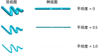 对于管的笔划,“平坦度 1”(Flatness1)和“平坦度 2”(Flatness2)分别定义各个管的底部和尖端的平坦度。对底部和尖端之间的这些值进行线性插值。