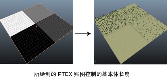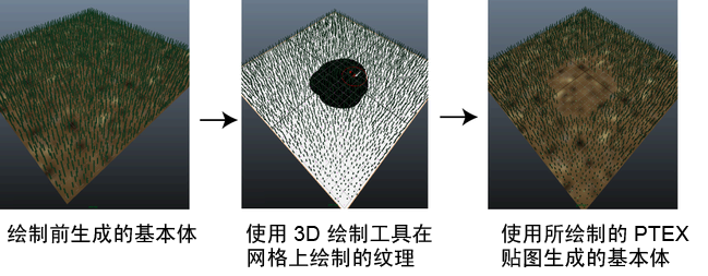 您可以使用带有 XGen 描述的 Ptex 文件来指定基本体的位置和密度,以及控制若干基本体属性。Ptex 文件作为贴图覆盖在多边形网格上。您可以使用 Maya 中的 Ptex 绘制或者使用在 Autodesk Mudbox 2012(或更高版本)中创建的 Ptex 文件来创建 Ptex 贴图。在 Maya 中,您可以使用 Paint 3D 工具来绘制纹理,纹理在由 XGen 保存时生成 Ptex 文件。